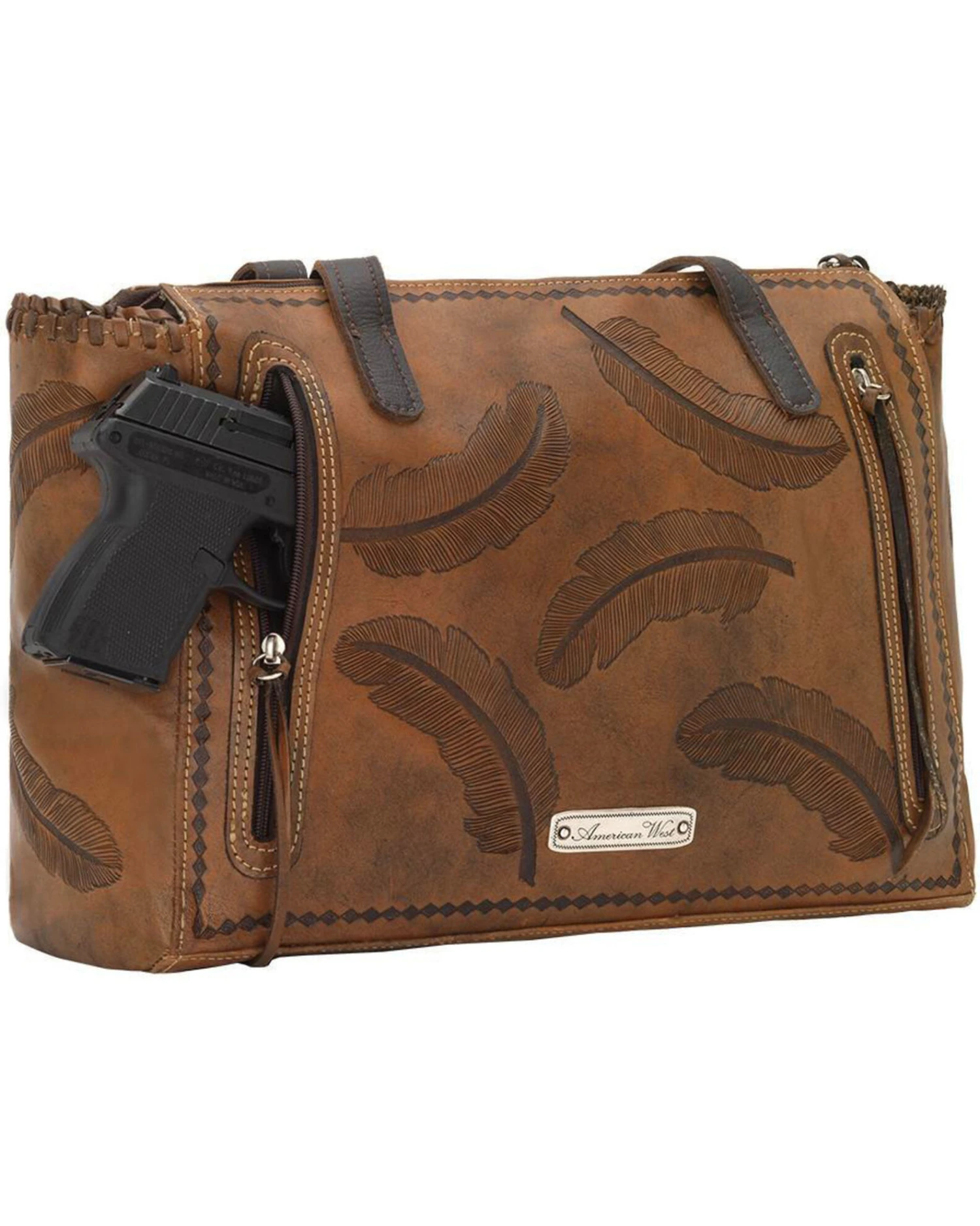 Cause a stir in your social circle when you appear with this tote from American West. This bag has leather construction with stylish bird feathers etched throughout that you will love. The back features a concealed carry pocket with dual zippers for easy access. Add the perfect finishing touch to your ensemble when you grab this leather tote from American West.