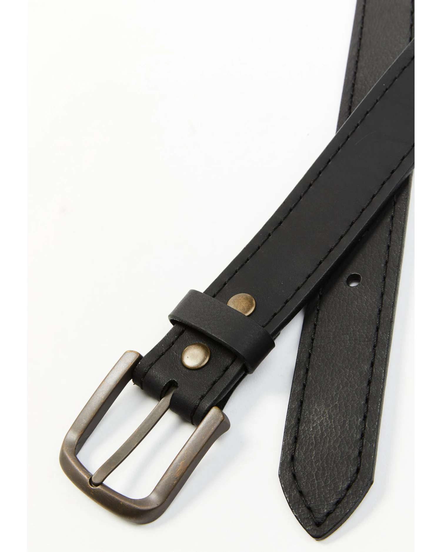 - Round brass-tone buckle